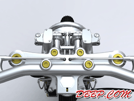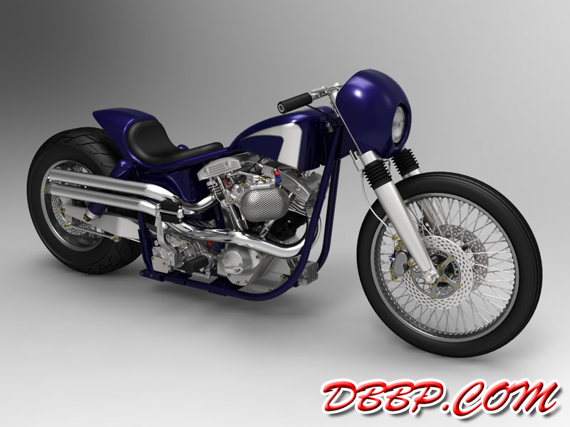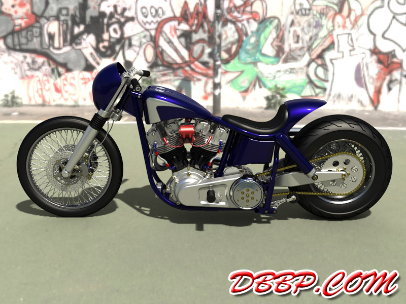 This bike has a stock 4-speed swingarm frame 6 April 2011: Modified beltcover, modified front motormount, added remote reservoirs for clutch and front brake inside fairing, modified gastank, added more detail to crankcases and to frame. 19 March 2011: New primary cover, removed side- mount plate and put it somewhere less ugly. (and less legal..) Rounded swingarm and forktrees more and added a whole bunch of nuts and bolts. 3 March 2011: New seat, Baker kickstart cover, narrowed belt, added front brakelines, modified pipes, started on midcontrols 20 February 2011: Started big update: new front brakes, headlight, handlebars & color, more coming soon 3 March 2009: Added new renderings, made with Hypershot. 22 August 2005: Added final details like throttle-cable, taillight, some nuts and bolts.... 25 August 2002: Added Avon 230 rear tire, mini Xenon headlights plus some new views.