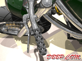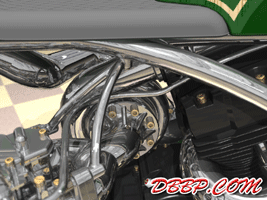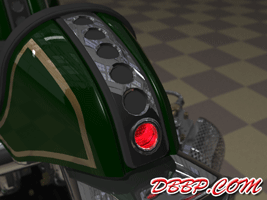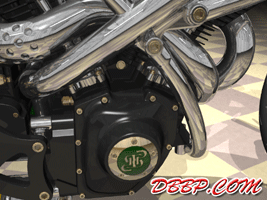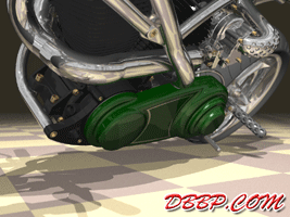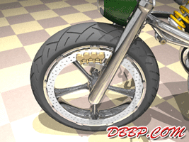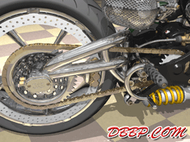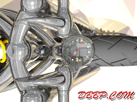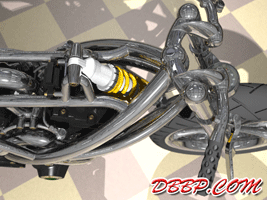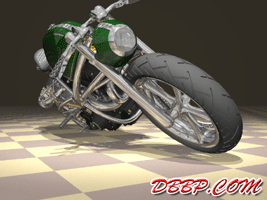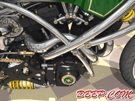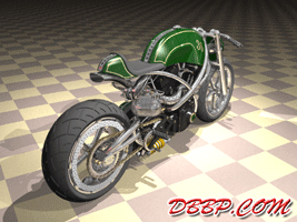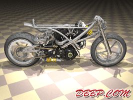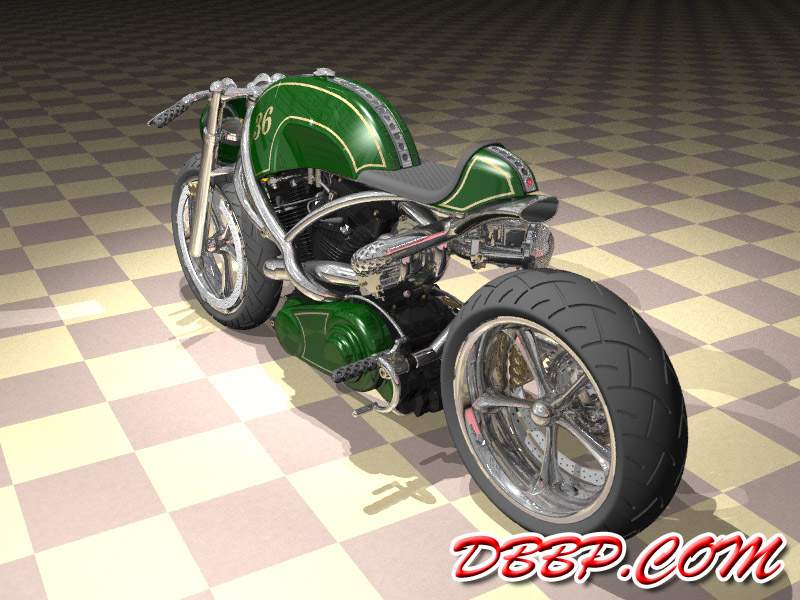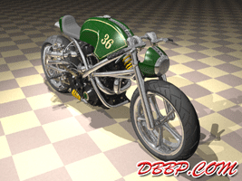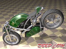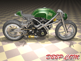 20 March 2007 Added taillight and some renderings with lights on. 13 March 2007 Added a revcounter hidden inside the fairing, also added radial controls for front brake and hydraulic clutch, built into the handlebars. 6 February 2007 Added rear brake linkage, plugwires and ignition coil 30 January 2007 I added fuelvalves and fuellines, did not have much time this week... 23 January 2007 I removed the slots in the rear sprocket and replaced them with holes to match the rest of the bike, also added shifter linkage and shift- and brakepedals 26 December 2006 I copied the perforated strap that I had on the fueltank to the fairing and rearend, and added rear footpedals. I also added the number 36 to the sides of the fueltank. 12 December 2006 I decided to go for a real racy riding position with the footrests mounted waaay back. The open belt and clutch were a problem so I designed a "british looking" primary cover to protect the left foot of the rider. I also added a very low mounted headlight with a mini-fairing or nacelle. Not sure yet if I am going to keep this... 31 October 2006 Added top motormounts (on both sides!) and moved the top mount of the front shock so that there is more room to adjust it. I also added a bracket for the Weber carb and added some more details to the brake calipers 17 October 2006 I added some 8 piston brake calipers front and rear, made a stainless steel drilled tankstrap and added handlebar grips (also drilled). The pipes are chrome instead of black now. 10 October 2006 Changed the chain tensioner and axle block on the swingarm, added some heatshields to the pipes, changed the brakediscs, made a slot in the top of the fueltank with a rubber strip, on top of this I will make a stainless steel mounting strap. I also added an aluminum oiltank under the gearbox 3 October 2006 Added some gold stripes to tank and rearend, changed the rear pipe to chrome and added clipon style handlebars, only these clamp to the top tree instead of to the forkleg, so I guess "officially" they are not really clipons at all.... 26 September 2006: I completed the rear suspension, added some reinforcements to the swingarm, added a solo seat with a new exhaust poking out from under it. Not really happy with the pipe yet, maybe next week I will try a different style. 19 September 2006: I added a removeable front framesection, on the left side it is connected to the beltplate, it connects to the front motormounts and on the rightside it sweeps up and connects with the frame. This piece can be removed to take out the engine and gearbox. I also redesigned the swingarm and added some slots to the rear sprocket. 12 September 2006: On the left side the gearbox and engine have been connected by a beltplate, that is connected to the tubeframe. On the right side the gearbox has a new beltcover that is also connected to the tubeframe. The rear motormounts of the engine have also been connected, so the whole thing is getting turned into a stiff and compact unit because the swingarm will not be mounted to the tubeframe but between beltplate and gearbox cover. The rear Ohlins shock has been positioned on the right under the gearbox leaving enough room for the oiltank. It will need some linkage to make it push instead of pull the shock. Oh yeah, I also added a cool gascap......... 5 September 2006: I added a Weber DCOE carb to the Garrett turbocharger, angled backwards to keep the bike narrow without inter- fering with the rider's legs. Also added more frametubes;-) 29 August 2006: I changed the pipes to tuck them in closer to the frame and modified the left side of the frame to make more room for them. I also had to cut some cooling ribs of the rear cylinder. I completed the "BMW Telelever" or "Hossack" front suspension with an Ohlins shock. 22 August 2006: Added a Garrett turbocharger, had to move the electric starter under the gearbox to make room for it. Worked on frame, added a fueltank in "British Racing Green", started work on exhaust pipes, and modified the pattern in the perimeter brakes. 15 August 2006: Designed a telelever front fork, like the newer BMW's have; a single shock will be mounted behind the neck. I also started work on the rear swingarm (yep, it has a front swingarm too...) making it a single sided swing that goes on the outside of the rear sprocket. A pair of perimeter brakediscs have also been added, now where am I going to put that turbo??? Or should I go for a supercharger? 8 August 2006: I added some 5-spoke wheels I designed in the same sizes as the Triumph Daytona 955I that am using as a "template" for the handling. The front wheel is 17 x 3.5 and the rear wheel is 17 x 6.0, tires are 120/70 ZR17 front and 190/50 ZR 17 rear. I also added chain and sprockets and some detail views. The bike can lean 55 degrees to each side without scraping any parts thanks to the raised gearbox and narrow belt/clutch. 1 August 2006: Started by using wheelbase, trail, rake and wheel/ tiresize of a 2006 Triumph Daytona 955I, combined with a Twincam A powerplant and a 6 speed rightsidedrive gearbox