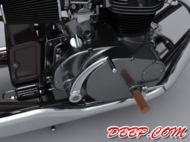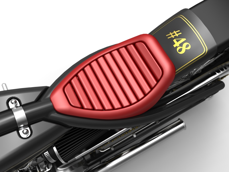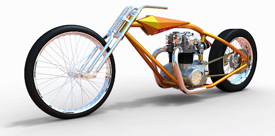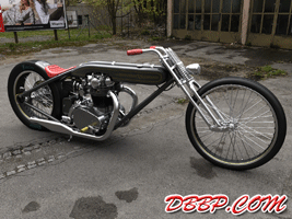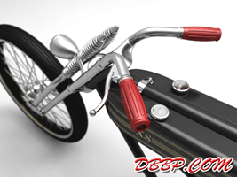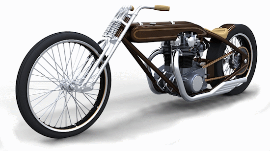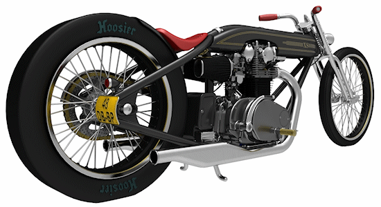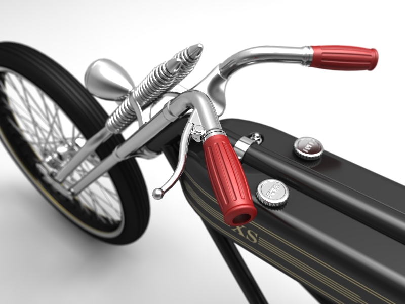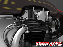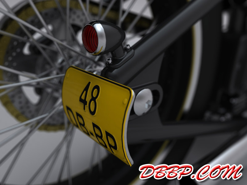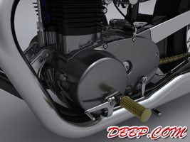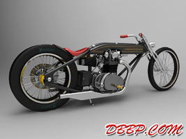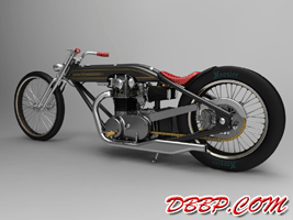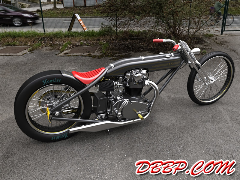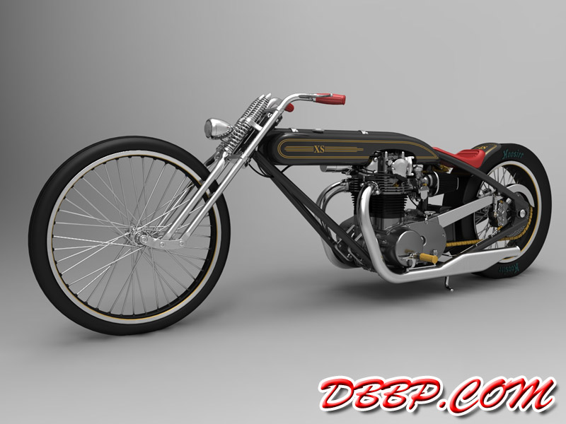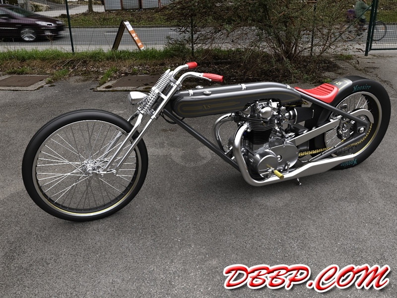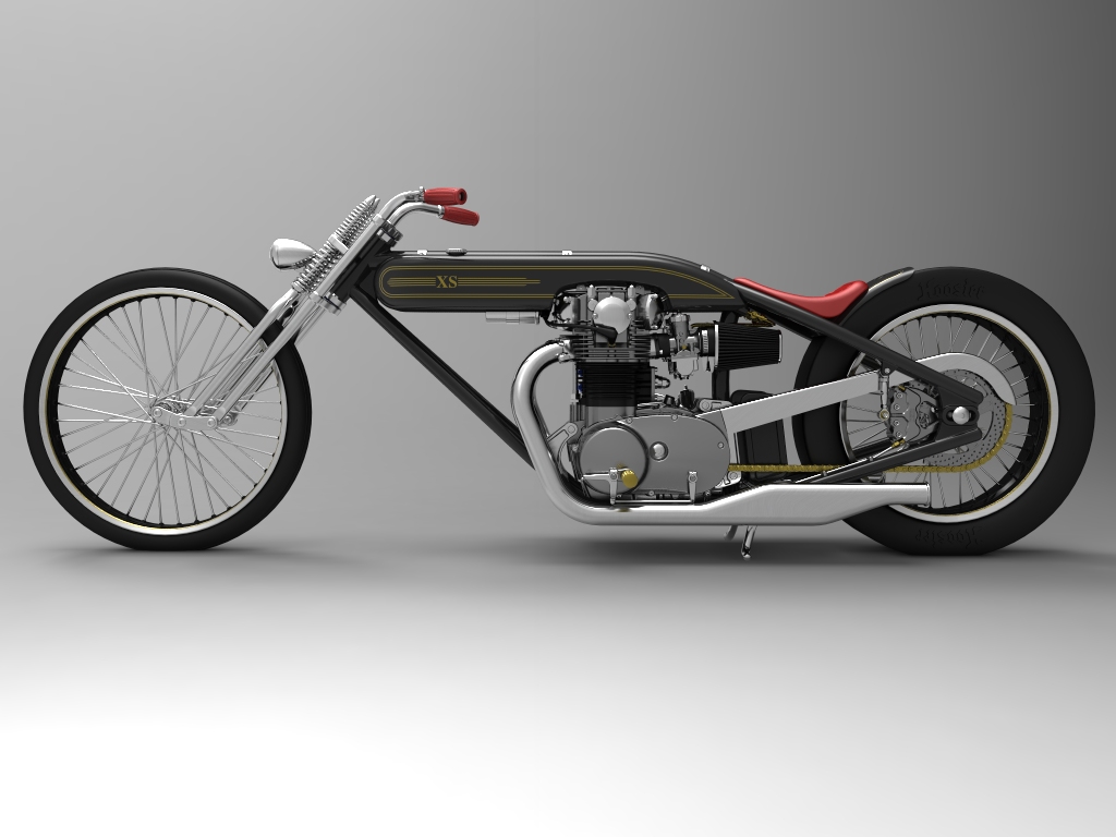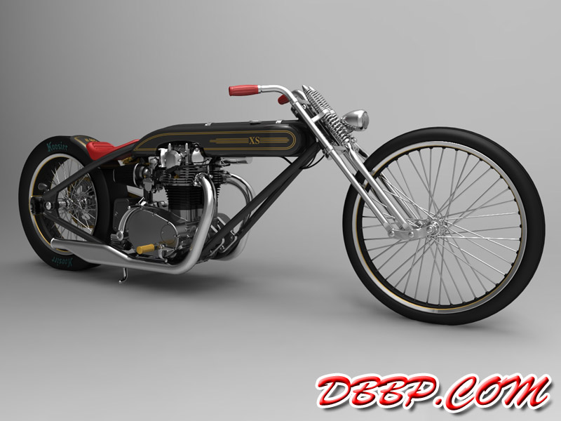 Cadbike #4, a Yamaha XS 650 digger style. 14 February 2011: Project completed! 29 January 2011: Added clutch handle, fuelvalves, fuellines, paint details, tire logo's 17 January 2011: Added ignition coil, sparkplugwires and chainguard. Modified left crankcase cover, added gusset in frame neck. Almost finished! 18 December 2010: Completed brake linkage and brakeline, added centerstand 8 December 2010: Completed shifter linkage, almost completed rear brake linkage. 29 October 2010: Started on footcontrols, added tank and fender graphics 4 September 2010: Added front sprocket, bigger airfilters, smaller pipes, pinstripes on rear fender and a small headlight. And a different color, again.... 1 July 2010: Kickstarter arm, new pipes, new paint 23 June 2010: Added seat, fuelcaps, fueltank mounts and batterybox, plus some extra views 10 April 2010: Added front motormounts, axle bolts, handlebar grips, rear fender 20 March 2010: Just changed the tank and the colour, looks like a completely different bike! 22 February 2010: Completed forks, narrowed front rim. Tried a prism tank, not happy with it yet.. 15 February 2010: Replaced the forks with a new ultra- narrow springer, added chain and rear hub details, removed rear fender.... 28 January 2010: Added spokewheels, lower forktree and rear fender. Also added a comments section at the bottom of this page. 19 January 2010: I replaced the 21" rear tire with an 18" slick, added ISR sprocketbrake, worked on frame and started with the ultra-narrow front forks 6 January 2010: I swapped one of my Harley CAD models for a model of a Yamaha XS 650 engine. This will be an ultra-narrow digger style bike.