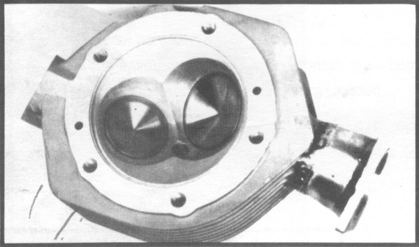 Harman's barrels are machined from 65,000 PSI Ductile iron featuring large cooling fins and a bore of 4 3/8". Each cylinder is also fitted with an O-ring seal to the head rather than the standard gasket. Oil return galleys through the barrels return oil from the spring pockets in the heads down through the front and rear of each cylinder and drain it just below the oil ring's travel point. This drainage onto the piston skirt helps prevent scuffing. Presently Harman is using Arias 8.5 to 1 forged pistons with .927" pins but may be switching to cast units in the near future. The pistons feature 3 ring construction and have longer skirts 2 1/4" below rings, than stock. The pistons are also notched for use with the high lift cams. Cylinder heads are cast from 356-T-6 aluminum and are finned to match the cylinders. Intake valves are 2 1/4" Chrysler Hemi type while exhaust is handled by 1 15/16" Manley. Exhaust guides fitted are steel Manley's while intakes are 5/16" Westons. The heads as they come from Harman are set up for dual 40mm carbs. At the moment John has found much success with the S&W "Blue Magnums" but any 40mm Dellorto etc. can be used. Leinweber springs and retainers must be used and the heads will accept any cam currently made for the 74'. While stock rocker boxes are used they must be shipped to Harman stripped, along with the lifter blocks for machining to a slightly steeper angle. Charge for this service is $30.00.