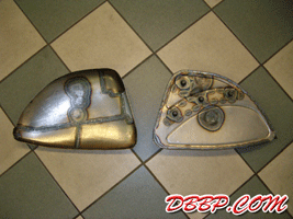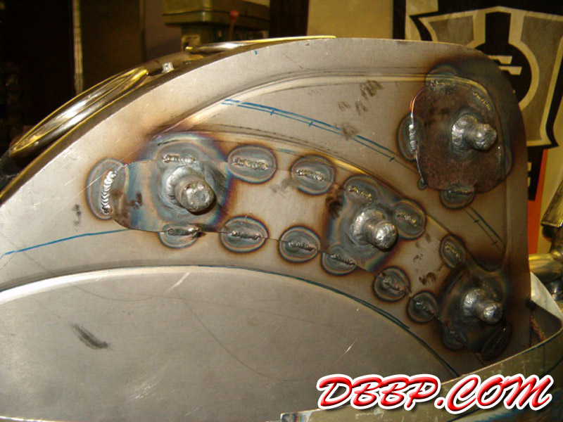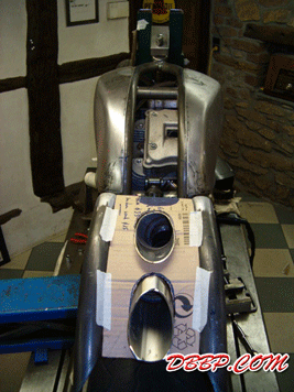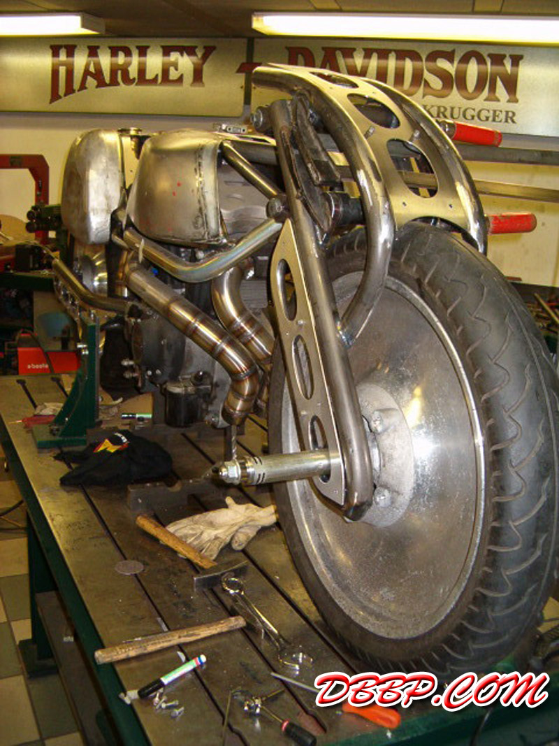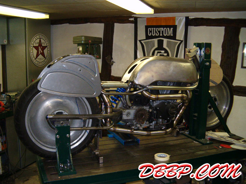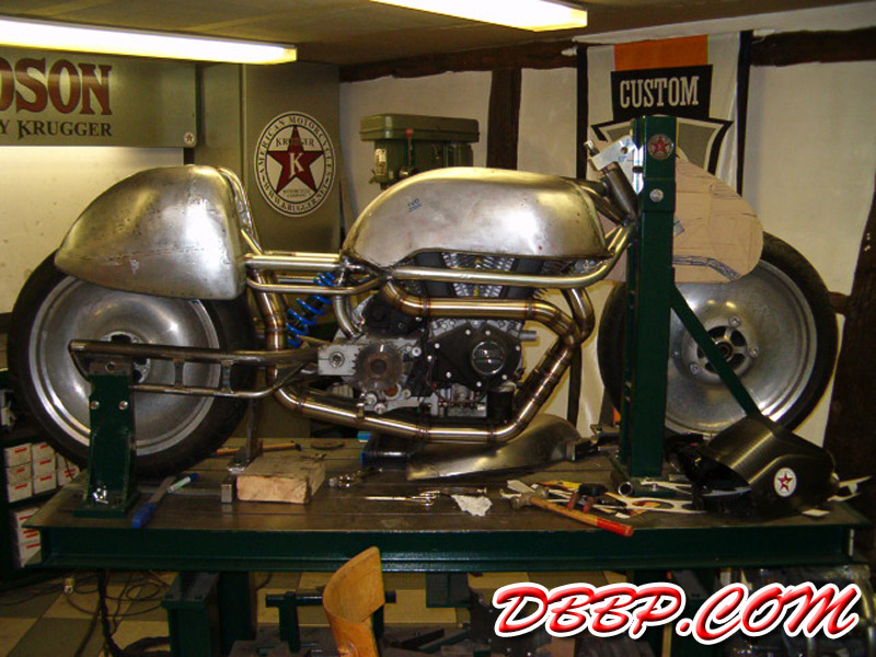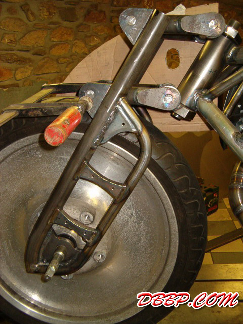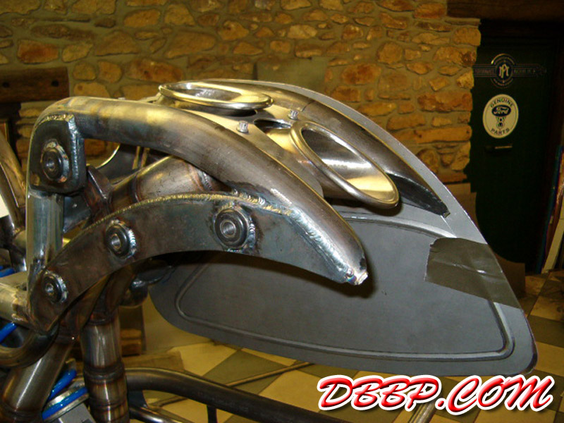 The fueltanks are on both sides of the rear wheel, the forks are homemade girders