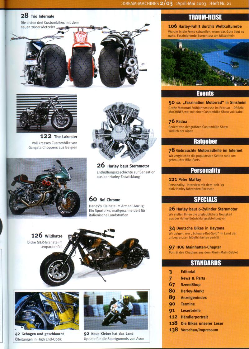 Dream Machines #2 April/May 2003 This German Magazine used the Starsix engine of my Cadbike #3 as an April Fool's joke, claiming Harley was planning to take it into production!