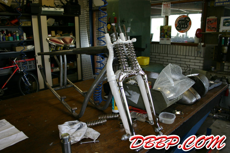 | Got some more cream powdercoated and nickel plated parts back, the top tree was brandnew and powdercoated black when I brought it to the plater, after plating the bottom looked great but the top was full of grind marks......looks like that will need to be machined and replated but the rest came out pretty good! |