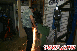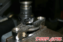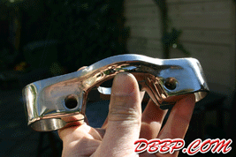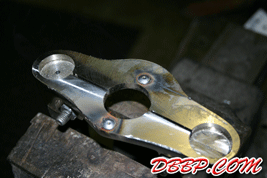 | After nickle plating the top tree of the springer looked like shit, I had bought it powdercoated black and this was what was underneath the powdercoat. We machined off a little bit of the top untill it was flat, beltsanded the "lip" off the front and sort of sculpted it into a nice smooth shape, now we will let the nickleplater have another try. |