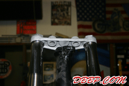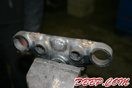 The top tree looked pretty messy with that big steering lock and dashmounts, so it needed some cleaning up. Aad ground off all the bumps and welded up all the holes and hey presto, a much cleaner looking top tree! To be continued..