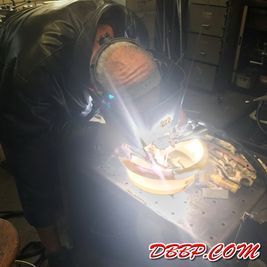 After we had figured out the correct diameter for the piston we did the last welding (for the bleeder nipple) on the transmission cover, with the part mostly under water to prevent warping. Then we put the cover in the lathe, with a counterweight to reduce vibration, and machined the hydraulic cylinder |