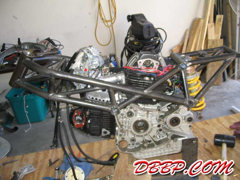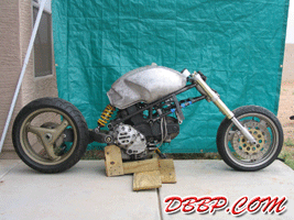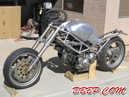 A good friend of mine, Rachel Dwyer, had just finished the 2003 Iron Butt Rally on her Ducati Monster. After reading her journals at www.tigerracing.net, I began to wonder what a Ducati Monster would look like if it had fairings and more "eye candy” in terms of styling. Thus on September 18th, 2003, I began the initial image concepts that became the basis of all of this. (see www.marksavory.com under [motorcycles]) Sometime later, I started seeing my Ducati concept images appearing across the Internet internationally. After seeing the response that my Ducati concept images were creating, I decided to create some more for the fun of it. What I tagged as the “Tigre Rapido” in honor of my friend Rachel in Seattle was thus created and posted on my website. Almost immediately, I determined that given the response, I had actually better start building one for myself before someone else does. The artwork evolved again to a more refined product moving away from the Ducati seat/cowl structure. Ultimately I decided to design a Bimota influenced one-piece bodywork to differentiate it from the standard Ducati and Harley bodywork. The prototype stage – let’s just say that we mocked up various concepts and built numerous frames until we derived a frame design that actually worked (and looked good with a rider on it). After playing in the backyard and small shop and building prototypes there, I figured that if I was going to do this right, I had better get a real shop and move my tools (and buy more equipment) and do this at a professional level ala my vintage Ferrari and IMSA GTP racing background. The first thing that we did was spend the first few weeks building a quality chassis jig that we could tweak any wheelbase, head angle and any tube location on. Although not shown (proprietary!), it now allows us to build a truly professional quality frame that is in perfect alignment at all times. We can replicate any existing Ducati chassis or build anything custom with this frame jig and it is a very important component of what we will be able to do in the future. The new bike then got underway. With the new equipment and new frame jig, we were able to miter and make perfect cuts the first time. TIG welding was easier as the tubes fit perfectly with zero gaps. We also evolved the frame from 1 inch main tubes with ¾ inch cross tubes to 1 ¼ inch main tubes with 1 inch cross tubing – partly for strength reasons but to also to keep our frame from being misidentified as a standard Ducati Monster frame. Then came the bodywork. Since the stock Monster fuel tank design in the past hadn’t worked, we decided to build our own from scratch. Somewhere along the line, we decided to try a shortcut and utilize a 996 biposto seat. After many days of consternation and frustration in creating a rear cowl design that looked good, we finally ditched the seat and went back to the original seat concept. One of the primary missions behind this project was not to utilize typical aftermarket parts or Harley catalog parts on this motorcycle. Thus everything was designed and built from scratch. Also at times this project has sounded like a Discovery Channel Biker Build off show in terms of what could go wrong. The seat upholster created a seat that didn’t fit the bike. We came home and tore it apart in the hopes of trying to salvage something . We built our own instead the day before the show! We had major problems with the motor that had been gone through only a few weeks before. Our paintwork had major problems just hours before the show – originally all the black was a deep gloss black across the body, headlight, front fender and taillight. Literally hours before loading the bike for the show, we ended up repainting all the gloss black paint to a semi-flat black color. Hours before leaving for the show, I pushed the bike outside for some quick pictures. This is the first time we actually had seen the bike with paint and partially assembled. Friday night at 11:57pm, the bike is loaded onto the trailer finally even though it is not fully finished!! We head off from Phoenix, Arizona to Long Beach, California for our debut of the bike. We get to the Los Angeles Calendar Motorcycle Show at the Queen Mary grounds at 7:48am. At just a bit after 8:00am, we roll onto the grounds and start setting up the display and roll the bike off the trailer. My brother is still in the Suburban attaching the seat for the first time to the bodywork. To put it mildly, we are dead tired. After spending literally days being awake and then driving all through the night, we just want to get some sleep. But the gates open at noon and the crowd starts coming in. The look and comments from the people enlivened us almost immediately. We are truly surprised at the favorable comments we get – from the crowd, from the publishing media, but also from the big name Harley custom bike builders that are there. (More details in the future as there are some surprises!!!) The comment we received a lot at the show was – look at what they did to a Ducati Monster! And the first thing we casually mentioned back was that the only true Ducati Monster part on this entire bike is the front fender itself. The front and rear suspensions are originally 996 components. The engine is actually a 900SS motor. The only actual aftermarket part on the entire bike is the FCR carburetors. We made the rest: the frame, the component locations and packaging structures thereof, the bodywork, the rearsets, the clutch cover, the exhaust system, the taillight, the headlight and so much more. We built it all to not only be different – but also in the hopes of inspiring others to take note and to build something different themselves. Sunday night and the show debut is finally over. We are exhausted. The bike is loaded and back to Phoenix we come. In looking back, we thought there might be a small amount of interest in a “sport cruiser” that utilized the strong hallmark d