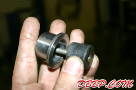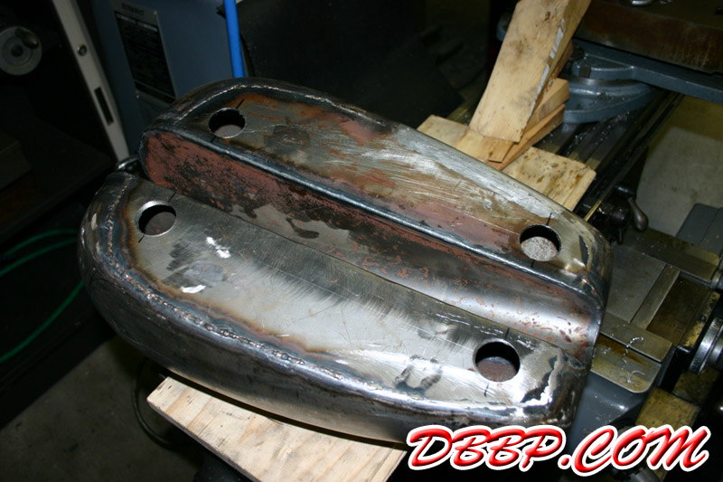 | We started working on the fueltank mounts, after measuring and drilling 4 small guide holes, we used the holesaw mounted in the Bridgeport to cut 4 big holes. I made a little sketch and Aad machined 4 "cups" that will flush mount the 4 rubbermounts. |