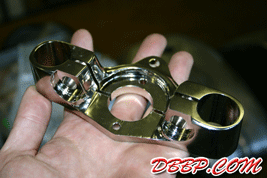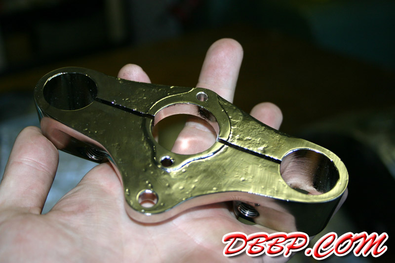 | Got some more cream powdercoated and nickel plated parts back, the top tree was brandnew and powdercoated black when I brought it to the plater, after plating the bottom looked great but the top was full of grind marks......looks like that will need to be machined and replated but the rest came out pretty good! |