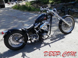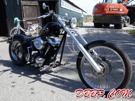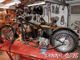 | Well, the Electraglide is running and this bike is back up on the table. Next job will be putting the speedo drive on the rear wheel. I will need to redo the pipes as Shovel pipes won't fit on an Evo. Then hook up the primary and off to registration. Now what I REALLY would want is to put that Harman fork that is hanging on the wall on this bike, but I have a feeling that the current fork will be easier to get registered...... |