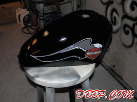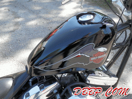 | A little update on the neverending project, haha. I have taken the rebuilt Shovelhead engine from this bike and am using it in my Electraglide at the moment. For this bike I bought a used Evo engine; you can pick these up pretty cheap nowadays. I found some tank-decals on the internet and put these on the temporary Sportster tank, under a layer of clear coat. |