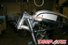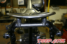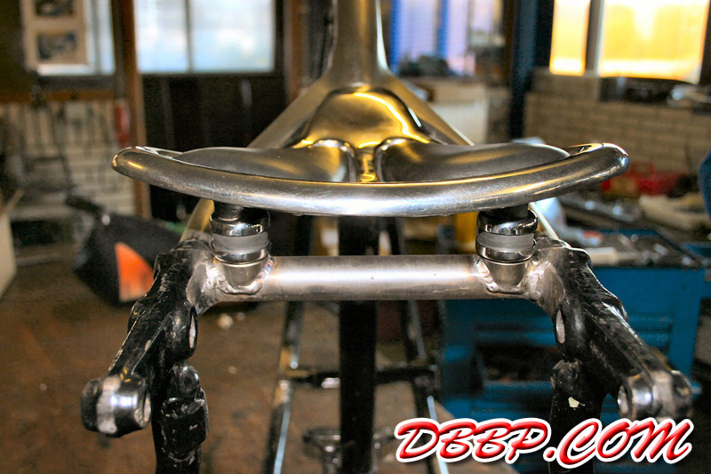 Aad removed a bunch of unneccesary brackets and added a few new ones; the neck area was cleaned up by cutting out part of the casting and welding in a piece of tube. This is actually stronger than the stock neck and it has a nice clean look.