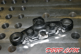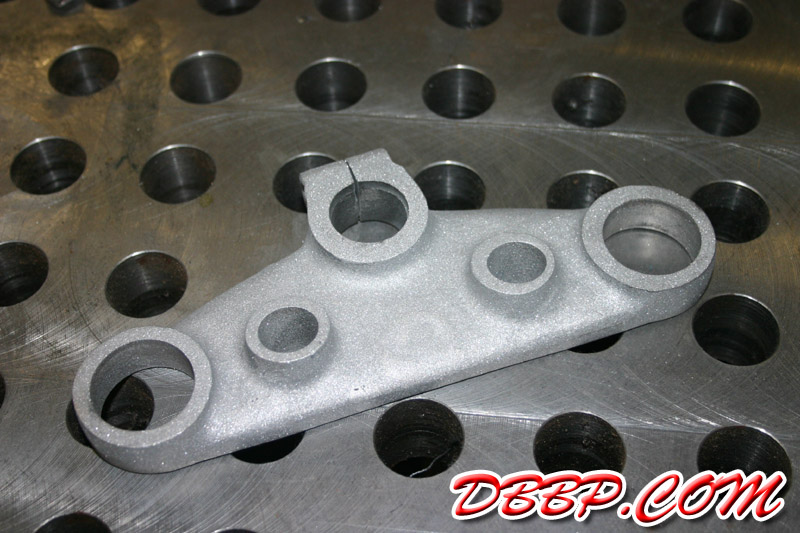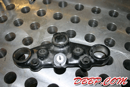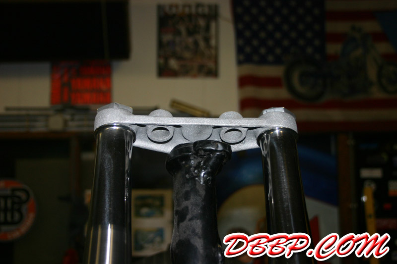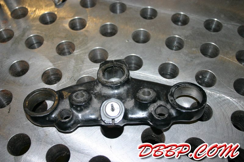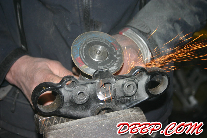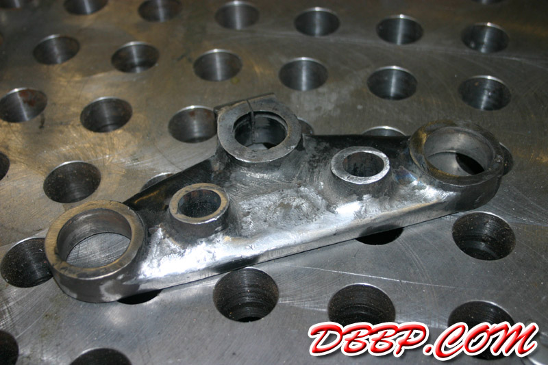 The top tree looked pretty messy with that big steering lock and dashmounts, so it needed some cleaning up. Aad ground off all the bumps and welded up all the holes and hey presto, a much cleaner looking top tree! To be continued..