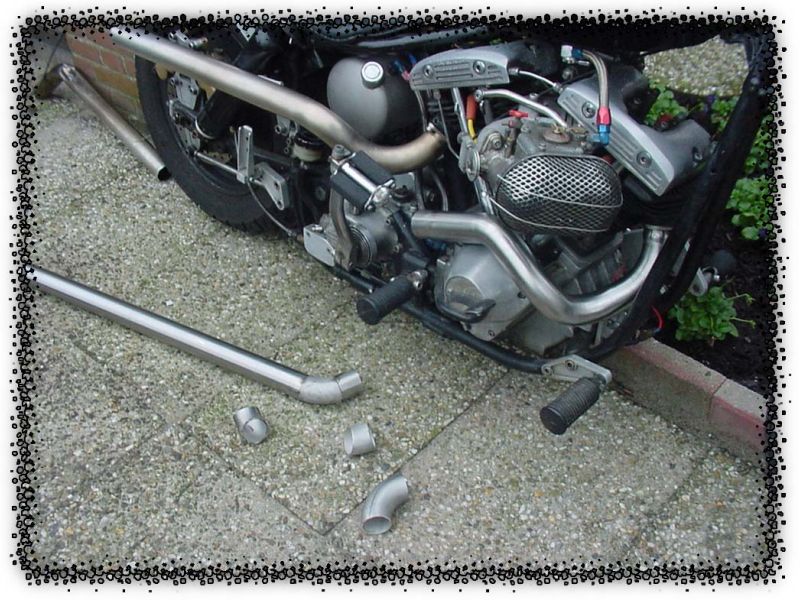 pipes and the pipes of a lot of other bikes 16) This is how far we got today, now it is time for more a lot more welding and grinding..... ![]() The finished pipes, except for the rear mounting brackets. Although they are not exactly like the drawing, I like 'em! More new pics in MyBikes